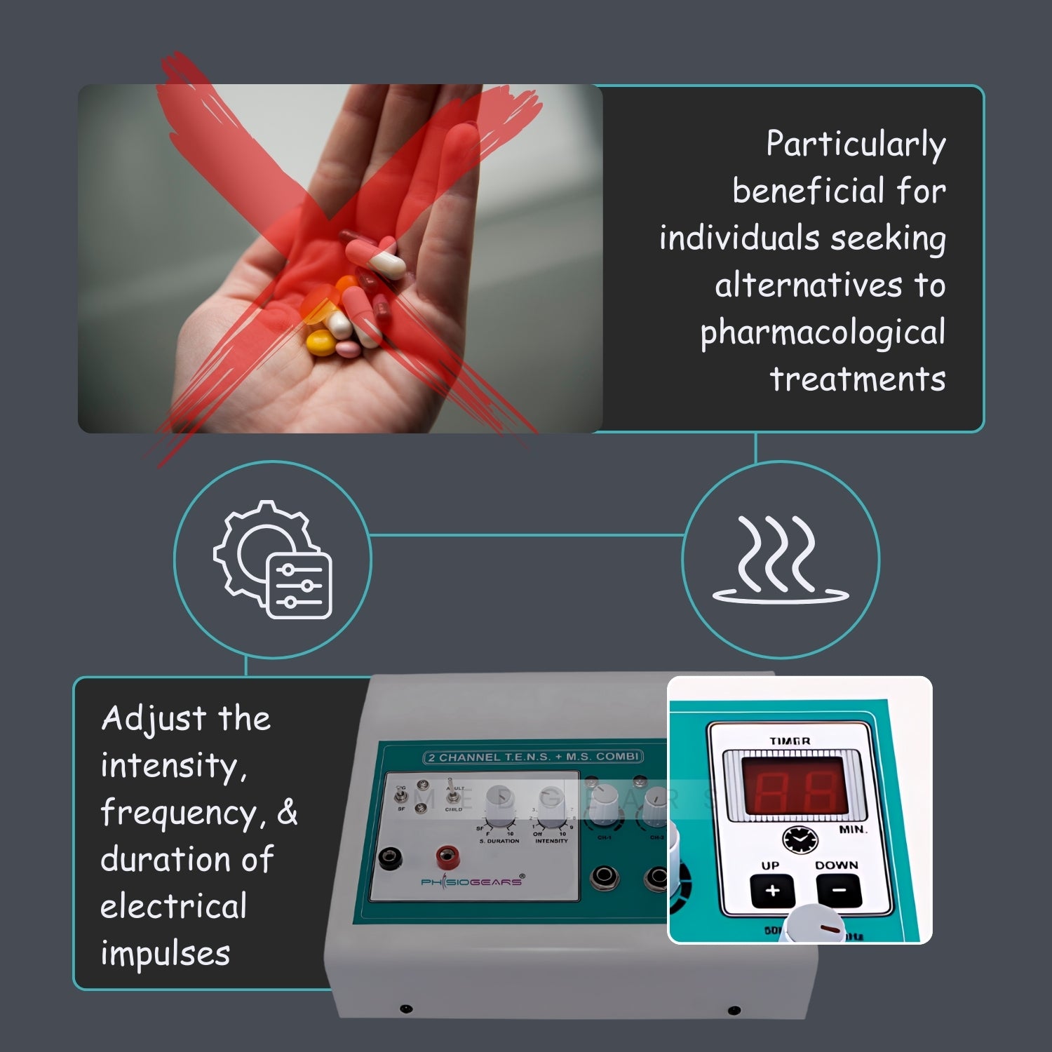 Electrical muscle stimulation (EMS) is a type of electrotherapy stimulates a muscle contraction using electrical impulses in order strengthen weak muscles Electrical muscle stimulation (EMS) is a type of electrotherapy stimulates a muscle contraction using electrical impulses in order strengthen weak muscles, reduce swelling, relieve pain and help heal wounds. This white combination therapy (Tens+Ms) WITH TIMER 0-99 MINUTE . by Physiogears is an electro therapy machine. It comes with built in backup and power input of 220V/50HZ. It also includes 2 channel with muscle stimulator accessories.