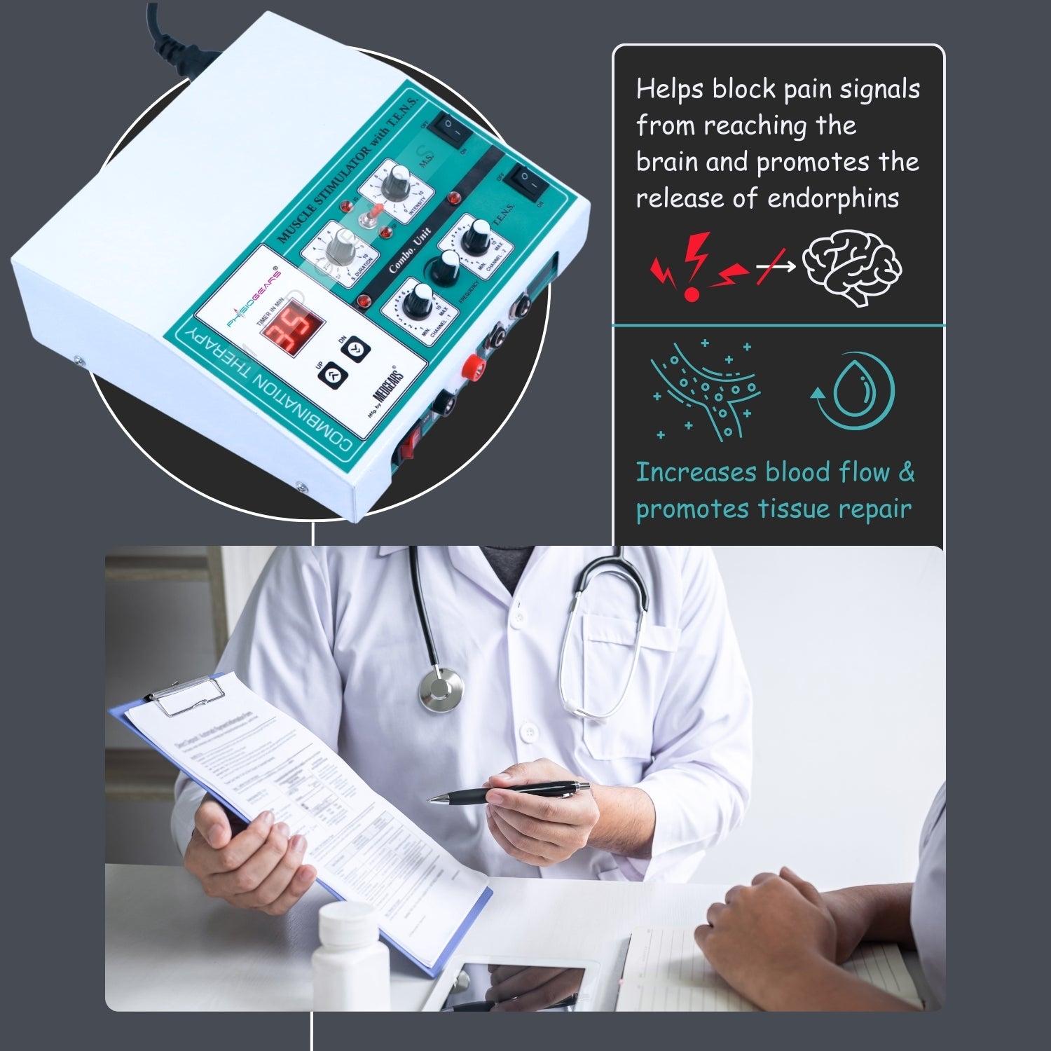 Physiotherapists and medical experts highly recommend the Physiogears TENS + MS (Timer) Combination Therapy Machine for its proven effectiveness in pain management and muscle rehabilitation. Combining TENS therapy for nerve pain relief and muscle stimulation for strength recovery, this device delivers safe, non-invasive, and drug-free therapy. Doctors trust the Physiogears TENS + MS Machine for patients dealing with muscle weakness, post-surgery recovery, or chronic pain, ensuring faster healing and improved mobility.